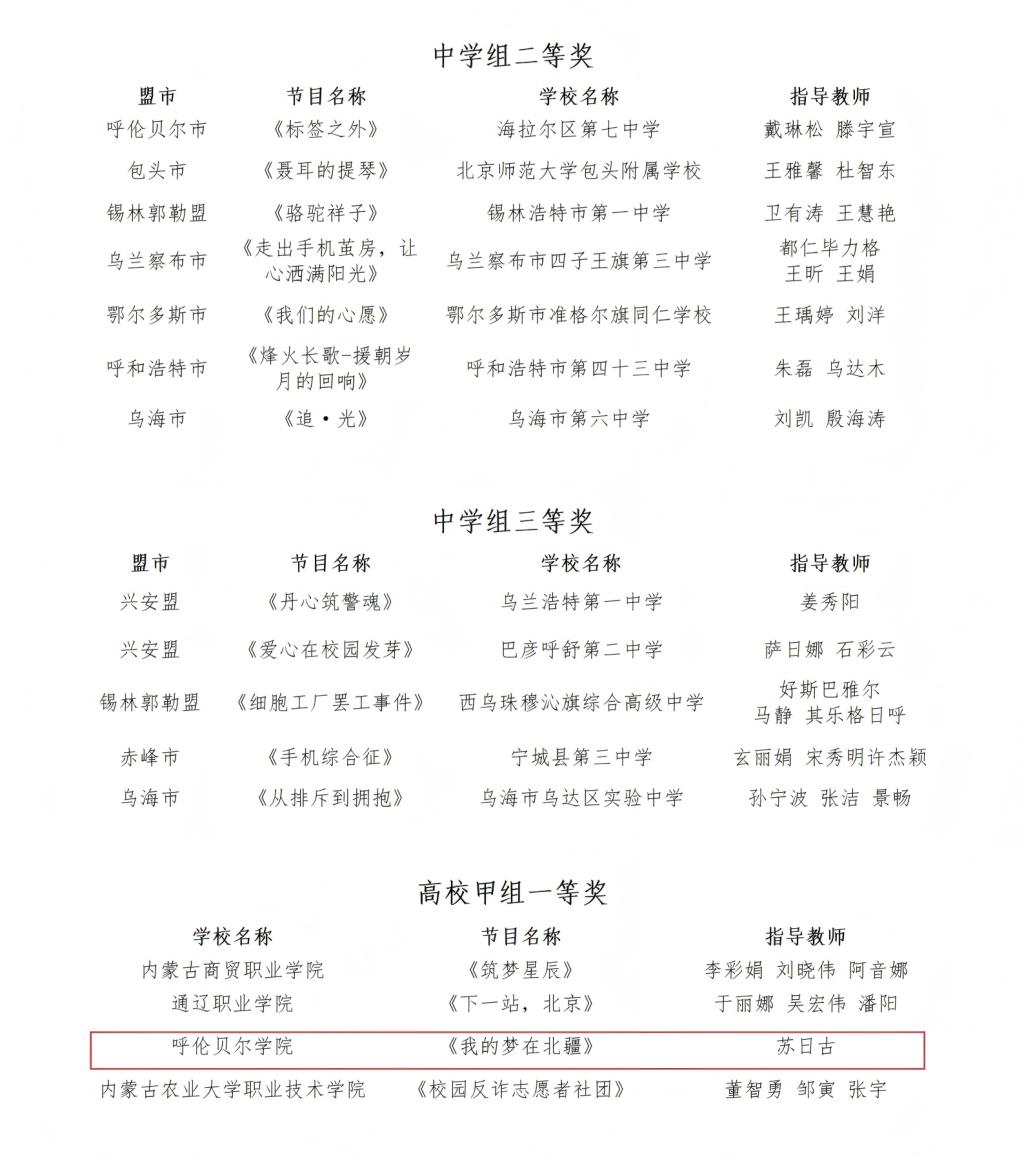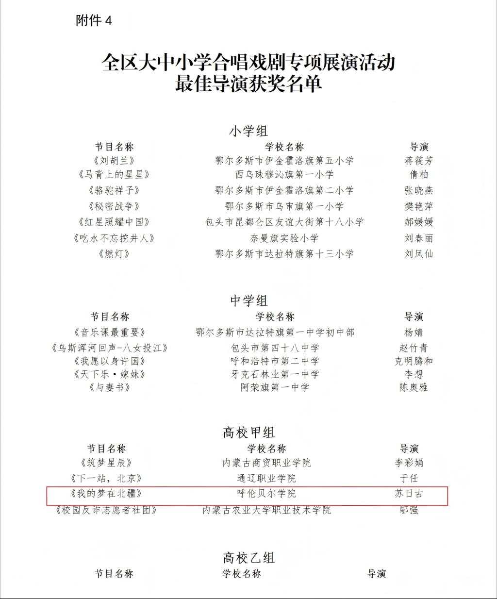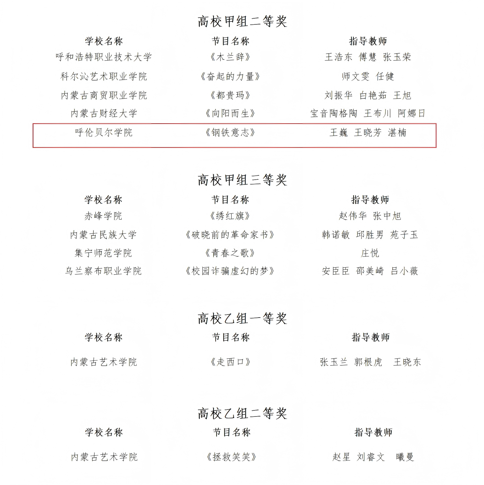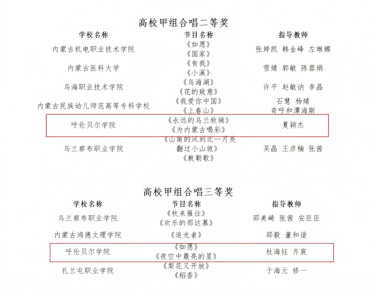 本次展演由內蒙古自治區教育廳主辦,以“綻放藝術風采 激發強國力量”為主題,吸引了全區多所大中小學的優質作品同臺競技,競爭激烈。我校學子憑借扎實的藝術功底、精湛的表演技藝與真摯的情感表達,交出了亮眼答卷:合唱作品《永遠的烏蘭牧騎》《為內蒙古喝彩》榮獲高校甲組合唱二等獎、《如愿》《夜空中最亮的星》榮獲高校甲組合唱三等獎;戲劇作品《我的夢在北疆》榮獲高校甲組一等獎、《鋼鐵意志》榮獲高校甲組二等獎,《我的夢在北疆》還榮獲高校甲組最佳導演獎、優秀創作獎。