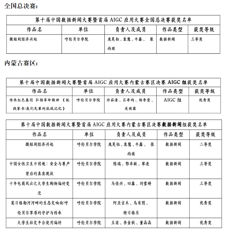全國(guó)總決賽中,文學(xué)院龐昊玨、袁慧、牛鑫、張雨琪四名同學(xué)的作品《微短劇經(jīng)濟(jì)的興起》,以嚴(yán)謹(jǐn)數(shù)據(jù)、新穎呈現(xiàn)與深刻洞察獲評(píng)全國(guó)三等獎(jiǎng)。內(nèi)蒙古賽區(qū)評(píng)選中,我校學(xué)子同樣亮眼:數(shù)據(jù)新聞作品獲二等獎(jiǎng)1項(xiàng)、三等獎(jiǎng)2項(xiàng)、優(yōu)秀獎(jiǎng)2項(xiàng),AIGC應(yīng)用作品獲優(yōu)秀獎(jiǎng)1項(xiàng),全方位展現(xiàn)了新聞學(xué)專(zhuān)業(yè)在數(shù)字內(nèi)容創(chuàng)作領(lǐng)域的綜合實(shí)力與育人質(zhì)量。