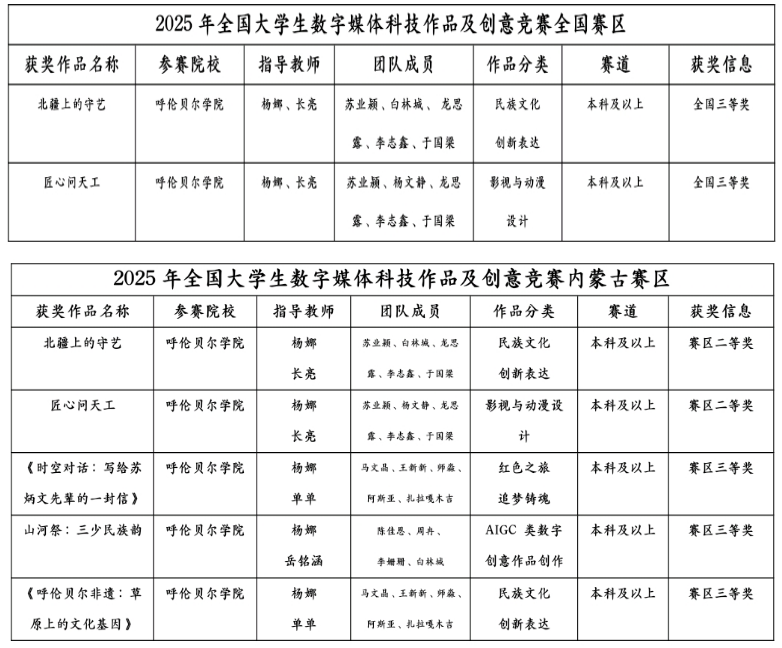 近日,2025年全國大學生數字媒體科技作品及創意競賽圓滿落幕。作為數字媒體領域極具影響力的全國性賽事,我校文學院新聞學專業學子憑借扎實的專業功底、出色的實踐能力與創新思維脫穎而出,在內蒙古賽區與全國總決賽中雙線告捷,斬獲多項重量級獎項,充分展現了專業實踐育人的豐碩成果。