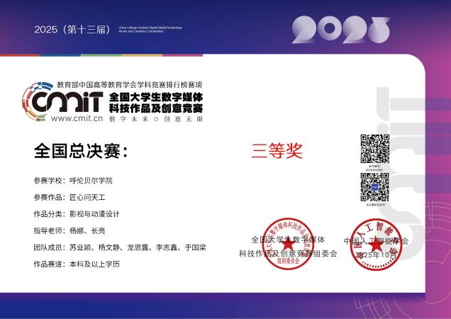 全國總決賽的激烈角逐中,蘇業穎、白林城、龍思路、李志鑫、于國良等同學組建的團隊表現亮眼,其創作的兩部作品憑借鮮明的創意主題、扎實的技術呈現與深刻的行業洞察,從眾多參賽作品中脫穎而出,雙雙獲評全國三等獎。在內蒙古賽區評選中,我校學子同樣捷報頻傳,成功斬獲二等獎2項、三等獎3項,全方位彰顯了新聞學專業學子在數字媒體創作領域的綜合實力。