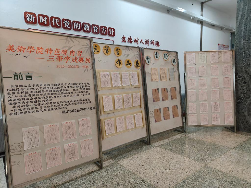 為深入落實師范生教學基本功培養,傳承和弘揚中華優秀傳統文化,美術學院以“特色晚自習”為載體,創新育人模式,于10月14日至12月10日,精心組織開展了主題為“筆韻攻堅,字藝精進”的“三筆字”技能提升訓練活動,并于活動收官之際舉辦成果專題展覽,全面展現學子們在書法技藝與文化修養上的成長蛻變。